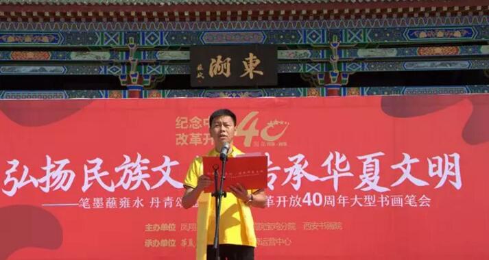 鳳翔縣政協(xié)主席魯立在本次大型書畫筆會上做了重要講話,魯主席表示:本次大會是以書為“媒”、以畫為“介”、以文會友的一件文化盛事。在鳳翔這片歷史文化沃土的養(yǎng)潤下,在40周年改革開放的紅利中,鳳翔綜合發(fā)展實力已躍居全省第8位。鳳翔縣作為西鳳名酒之鄉(xiāng)、省級歷史文化名城,自古就是關中西部政治、經濟、文化中心,改革開放以來,鳳翔縣更是在大力弘揚華夏文明,推動歷史文化名酒西鳳酒的發(fā)展上,做出了重要貢獻。魯立主席表示,希望在鳳翔這片人杰地靈的沃土上,通過本次書畫筆會,創(chuàng)作有情感、有溫度、有底蘊的書畫作品,表達對改革開放40年最具詩意的致敬。
