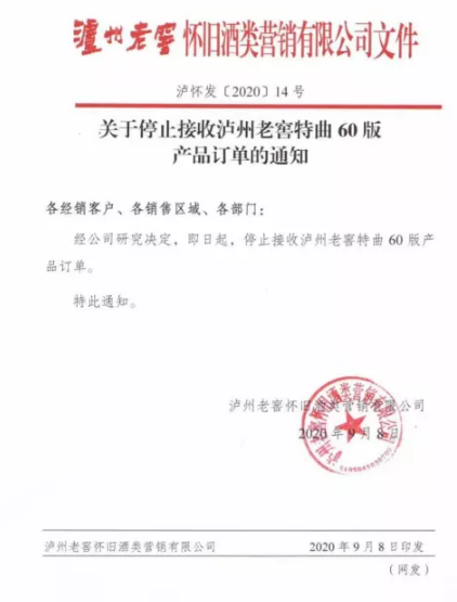 9月8日,酒說記者從市場獲悉,瀘州老窖懷舊酒類營銷有限公司發布通知稱,經公司研究決定,即日(9月8日)起,停止接收瀘州老窖特曲60版產品訂單。
