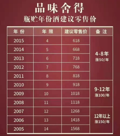 10月16日,舍得酒業(yè)發(fā)布《品味舍得瓶貯年份酒建議零售價(jià)》,從售價(jià)表中可以看到,品味舍得對(duì)2005年到2015年生產(chǎn)的年份酒給出了不同定價(jià):4-8年漲50元/年,9-12年漲100元/年,12年以上漲150元/年。