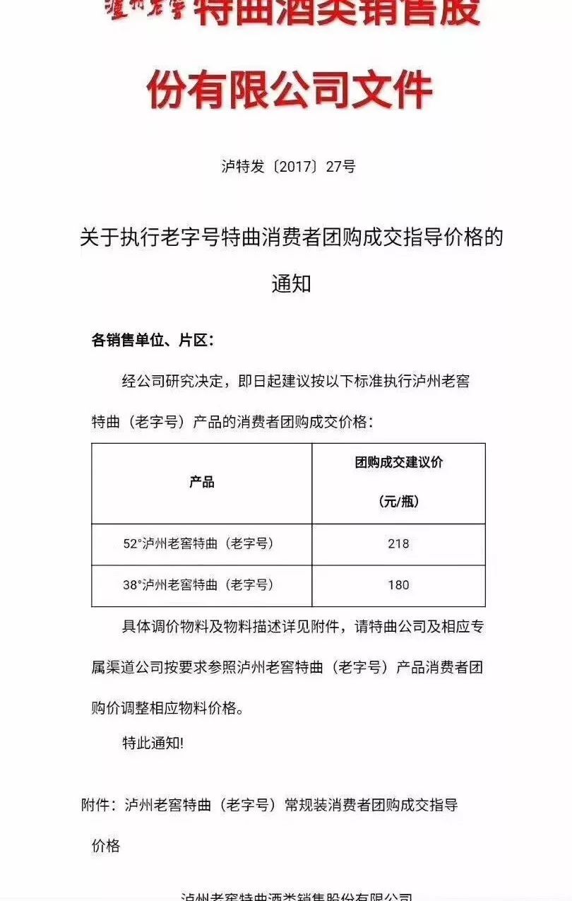 通知中指出,即日起52度瀘州老窖特曲(老字號(hào))團(tuán)購成交建議價(jià)調(diào)整為218元/瓶,38度調(diào)整為180元/瓶。以52度為例,比2016年11月21日確定的消費(fèi)成交價(jià)不低于198元高出了20元。