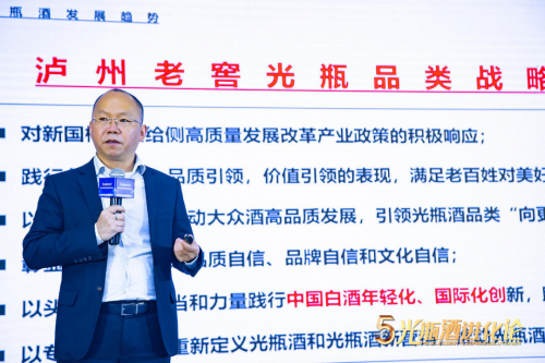 活動現場,瀘州大成濃香酒類銷售有限公司總經理楊成以《從消費趨勢尋找一款好光瓶酒的構成因素》分享了瀘州老窖黑蓋現象級產品的背后邏輯。他表示:“光瓶酒加速迭代進入“名、優、新”時代。未來光瓶酒在價值和價格上必須要大幅度提升,才能更好的適應不管是企業的發展、行業的發展、消費者的需求。”