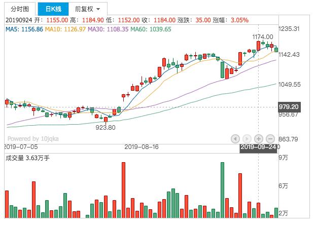 據(jù)查閱可知,2009年9月24日貴州茅臺(tái)的股價(jià)約為64元/股,即10萬(wàn)元可買(mǎi)大概1562股。但因最低交易限額一手等于一百股,62股沒(méi)法買(mǎi),因此按1500股計(jì)算。而2019年9月24日的股價(jià)為1184元/股,大概是09年同期的18.5倍。1500股現(xiàn)在價(jià)值1,776,000元,比當(dāng)時(shí)10萬(wàn)本金增長(zhǎng)了17倍多,而且這還沒(méi)算過(guò)去10年中茅臺(tái)的分紅和送股等。
