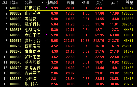 貴州茅臺[4.90% 資金 研報]漲4.92%,早盤沖高后,中盤階段休眠震蕩。釀酒板塊目前漲3.1%,9成個股翻紅,通葡股份[9.99% 資金 研報]、山西汾酒[7.70% 資金 研報]、啤酒花[6.55%資金 研報]、老白干酒[5.28% 資金 研報]領(lǐng)漲;珠江啤酒[0.21% 資金 研報]、迎駕貢酒、ST酒鬼翻綠。