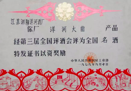 1989年,在第五屆全國評酒會上,洋河酒蟬聯(lián)“中國名酒”三連冠。55度、48度、38度洋河大曲分別獲得國家質(zhì)量獎三塊金牌,28度洋河大曲榮獲國家質(zhì)量獎銀獎。53度雙溝大曲、39度雙溝特液、46度雙溝大曲被評為國家名酒,榮獲金質(zhì)獎?wù)?33度雙溝特液獲得“國家優(yōu)質(zhì)酒”稱號,獲得銀質(zhì)獎?wù)隆?/p>