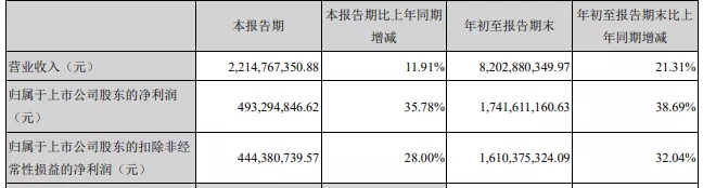 公司前三季度實現營收82.03億元,同比增長21.31%;凈利潤17.42億元,同比增長38.69%。其中第三季度公司實現營收22.15億元,同比增長11.91%;實現凈利5.06億元,同比增長35.56%。
