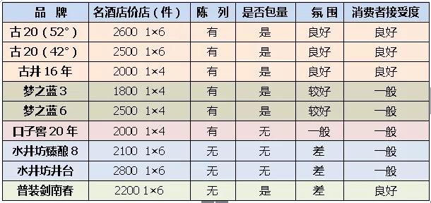 此外,洋河的夢系列、口子窖20年、水井坊臻釀8、水井坊井臺、高爐家和諧年份20年、30年等產(chǎn)品在亳州市場也有銷售,但與古井貢、劍南春相比有一定的差距。