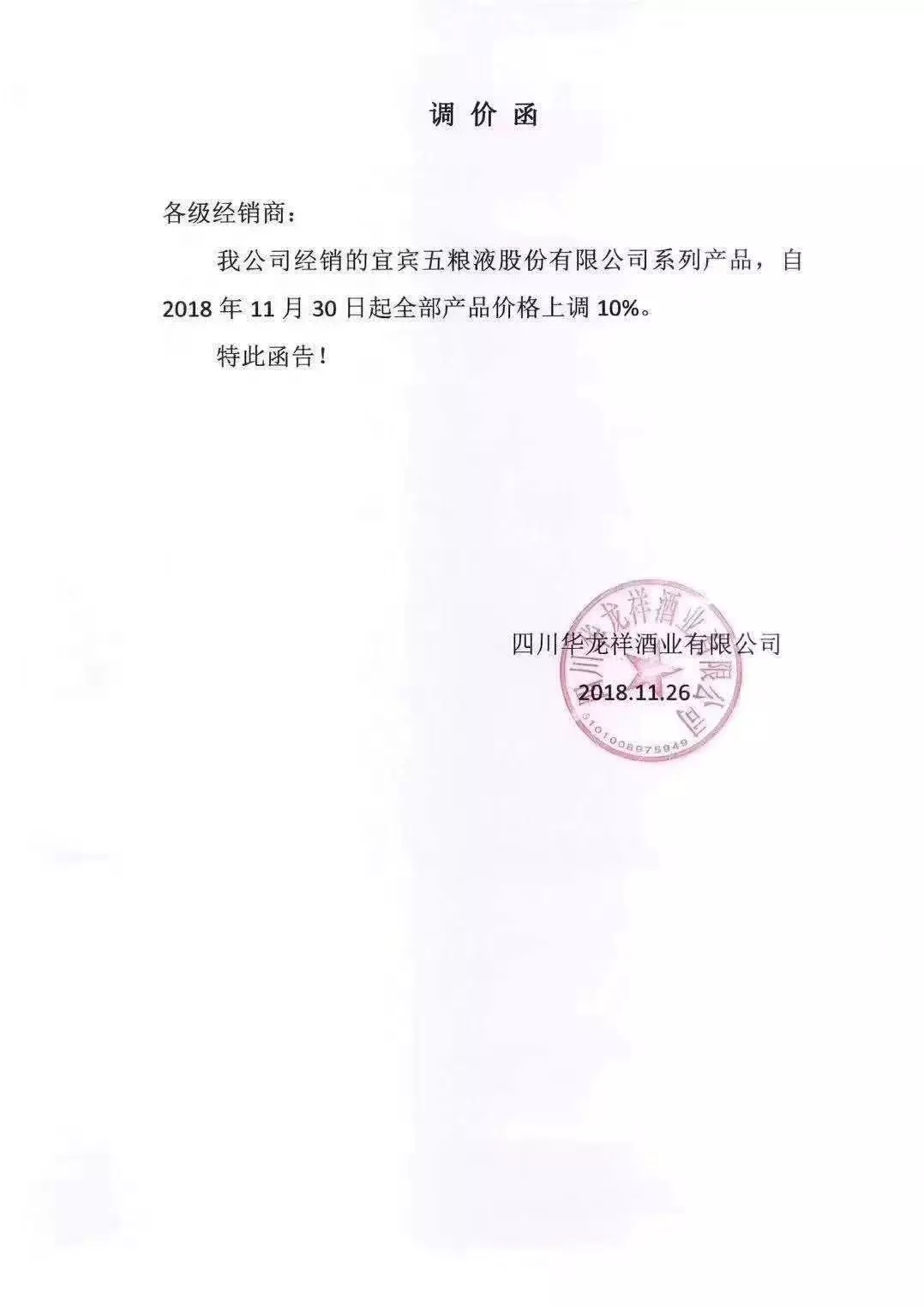 新政誘發的“蝴蝶效應”逐漸顯現。近日,多家五糧液股份公司系列酒總經銷產品及其經銷商向分銷商、終端商發布提價通知:宜賓五糧液股份有限公司系列產品,自2018年11月30日起全部產品價格上調10%。其中,五糧液股份公司旗下總經銷產品“聖酒”系列的提價幅度達到25%,高于其他系列酒的總經銷產品。