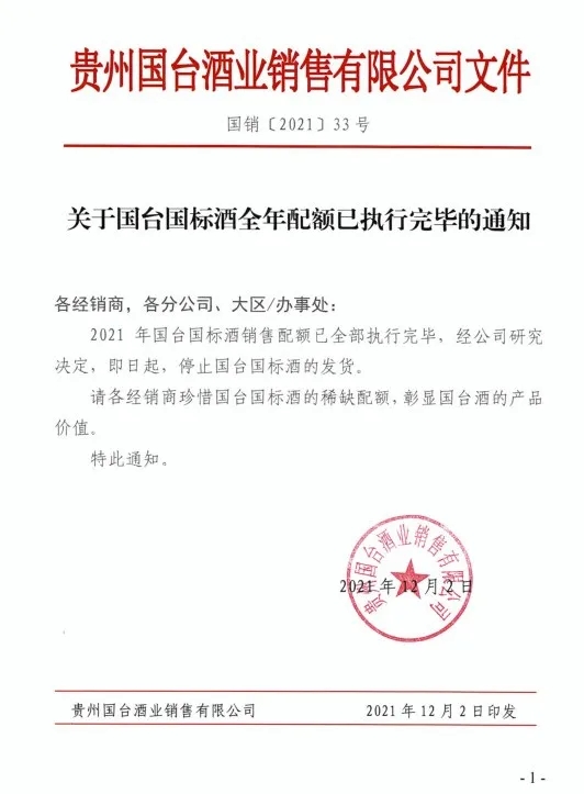 12月2日,貴州國臺酒業銷售有限公司發布《關于國臺國標酒全年配額已執行完畢的通知》,通知顯示,2021年國臺國標酒全年配額已執行完畢,即日起停止發貨。
