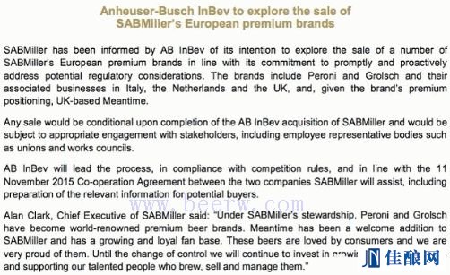 今天下午,百威英博證實,該公司探討出售SAB米勒部分歐洲業務。在一份聲明中,它表示,本著迅速和積極主動解決潛在的監管要求的考慮,百威英博正和SAB米勒緊密合作,正在一起探討出售SAB米勒旗下歐洲高端品牌和有關業務。百威英博將在未來幾周接觸一些潛在買家,以評估它們對于Peroni 和Grolsch品牌家族及其在意大利、荷蘭、英國的相關業務的興趣。