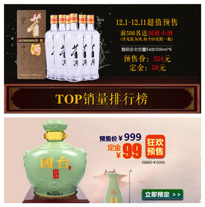 董酒和國臺在今年的雙十一酒企銷量戰(zhàn)績可謂是令人驚嘆,其一舉超過五糧液、茅臺、洋河、瀘州老窖等眾多知名大牌,二者排名緊跟據(jù)稱第一的金沙。而這次雙十二品牌盛典,董酒和國臺的活動使驚人的相似,首先都是先推出了一款預售品,接著是都列出了雙11爆款TOP榜來引領消費和宣傳雙十一的戰(zhàn)績,最后是將其他產(chǎn)品分區(qū)列表,二者活動驚奇的相似不知這次的成績也還會相近嗎?