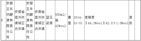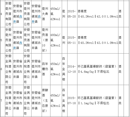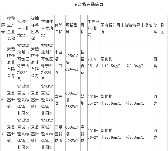 不合格樣品所涉及的標稱生產經營單位、產品和不合格指標具體信息如下:安徽皖情酒業有限公司生產的小白瓶(白酒)(生產日期/批號:2015/5/18)氰化物超標;涇縣高升酒廠生產的宣曲酒(生產日期/批號:2015/5/27)、三星宣谷坊酒(生產日期/批號:2015/6/27)氰化物超標;安徽亳州貢酒有限公司生產的亳州大典酒(生產日期/批號:2015/5/20)、亳州貢酒(原10漿)(生產日期/批號:2015/5/11)酒精度不合格;安徽金滿院酒業有限公司生產的百年糟坊酒(生產日期/批號:2014/12/18)、原釀酒(生態原漿)(生產日期/批號:2015/7/18)檢出甜蜜素;安徽玉井坊釀酒有限責任公司生產的藍花瓷酒(生產日期/批號:2014/01/01)酒精度不合格。