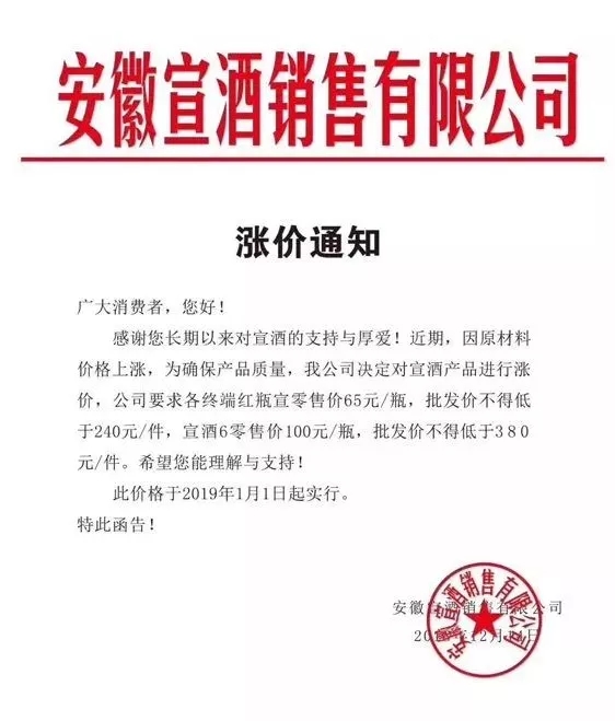 日前,酒業家記者從市場層面獲悉,安徽宣酒銷售公司下發漲價通知,稱因原材料價格上漲,決定對宣酒產品提價。其中,徽酒60元價格帶最大單品紅瓶宣酒提價后的終端零售價為65元/瓶,批發價不得低于240元/件,宣酒6零售價100元/瓶,批發價不得低于380元/件。本次提價將于2019年1月1日起正式實行。