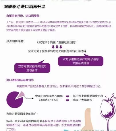 在提到進口酒時,張少剛用“豐富了中國消費者的餐桌”來詮釋智利進口酒等農產品登陸中國市場,而目前,智利已成為中國進口葡萄酒的第二大來源國,在《議定書》的推進下,智利進口酒的通關效率將得以提升。張少剛解釋說,《議定書》簡化“直接運輸規則”,企業可免于提交中轉地海關出具的中轉證明材料,此外,雙方還承諾推進原產地電子信息交換系統建設,引入電子原產地證書,更方便企業傳輸、使用和保存;雙方同意加強海關的交流與合作,對雙邊貿易有關的海關事務及時通報,降低通關成本,提高通關效率。