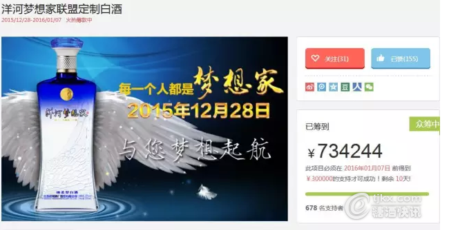 與此同時,“洋河夢想家”京東眾籌活動也同步開始,據悉,此次“洋河夢想家”在京東眾籌上的眾籌目標是30萬,持續時間為10天,截止為2016年1月7日。而洋河夢想家一上線,就受到了廣大經銷商的熱捧,截止今日16:30,“洋河夢想家”京東眾籌項目已提前完成,眾籌金額達391427元。截止記者發稿時,眾籌金額已達到734244元,并呈現不斷上漲趨勢。