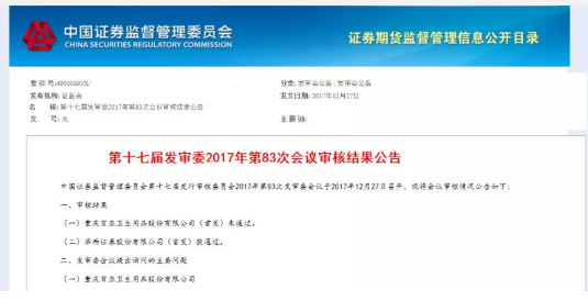 《財經嘯侃》特約、獨家撰稿人五谷君注意到,中國證監會第十七屆發審委2017年第83次會議審核結果公告顯示,12月27日,華西證券(首發)獲通過。不過,華西證券部分問題也被發審委指出。