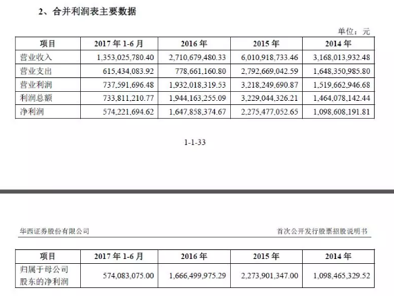 2014年、2015年、2016年和2017年1-6月,華西證券分別實現營業收入約為31.68億、60.1億、27.1億和13.53億元,波動幅度巨大,在50%以上;歸屬于母公司股東的凈利潤分別約為10.98億、22.74億、16.66億和5.74億元,同樣也是上下波動。