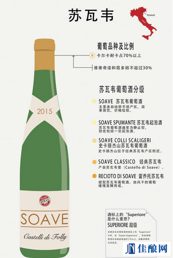蘇瓦韋(Soave)是意大利北部的一個中世紀村莊,出產(chǎn)由卡爾卡耐卡(Garganega)釀制的蘇瓦韋白葡萄酒。蘇瓦韋白葡萄酒以哈密瓜、柑橘風味以及較佳的陳年潛力知名。