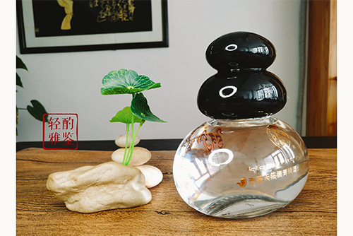 這款酒瓶采用的是晶白料玻璃,通體透亮。外形像極了藏區用鵝卵石堆起來的“瑪尼堆”,瓶身飽滿,憨態可掬,握在手里,似乎也能像瑪尼堆那樣,給飲者帶來吉祥如意。