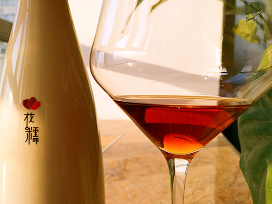 我有些迫不及待,開啟瓶塞,將酒倒至高腳杯——有人可能會覺得我并不專業,喝黃酒怎么能用高腳杯呢?事實上,用水晶高腳杯更加便于觀察酒體顏色,這和葡萄酒是一樣的道理。將酒杯置于光線充足且白色的背景之下,酒體呈現出一種比琥珀色更加透亮的一種紅色,清澈,略顯粘稠。評判黃酒好壞的環節有很多,在“觀色”環節,不論酒體顏色深淺,是黃、是紅還是紫,好的黃酒一定是非常清澈透亮的。