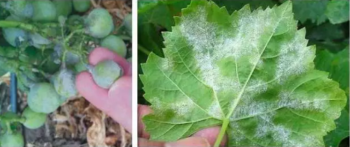 白粉病是葡萄的常見病害之一,一般在6月中下旬開始發病,7月中旬漸入發病盛期,該病主要危害葉片、枝梢及果實等部位,以幼嫩組織最敏感。