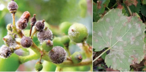 葉片感染嚴重時會卷縮枯萎。果粒表面有灰白色粉狀霉,擦去后表皮呈現褐色花紋,受害幼果容易開裂。新枝蔓受害,初呈現灰白色小斑,后擴展蔓延使全蔓發病,病蔓由灰白色直至變為黑色。