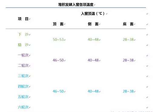 高溫堆積具體是將攤晾拌曲之后的糧醅(酒醅)收攏成堆,通過自然發(fā)酵升溫的過程。當堆積的糧醅(酒醅)堆頂溫度達到要求之后,才可入窖發(fā)酵(各輪次堆積發(fā)酵入窖各項溫度見下表)。