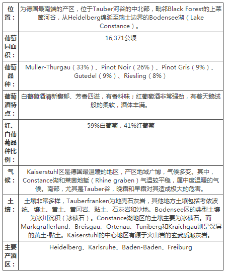 由于氣候的關(guān)系,該產(chǎn)區(qū)較為適合紅葡萄的生長,有55%的葡萄園都是種植與Burgunder同族的葡萄,包括斯貝博貢德(Spatburgunder)、Grauburgunde和威斯堡格德(Weissburgunder),單單是斯貝博貢德(Spatburgunder)就占了26%。至于白葡萄品種雷司令(Riesling),它只占8%。米勒-圖高(Muller-Thurgau)的種植量在近年里大幅度下降,漸漸被斯貝博貢德(Spatburgunder)取代。Gutedel的種植量超過整個德國的97%,成為德國唯一的且名符其實的Gutedel產(chǎn)區(qū)。