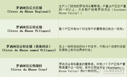 法國(guó)羅訥河谷(Rhone Valley)的葡萄酒一共被分為了4個(gè)等級(jí),從低到高依次如下所示: