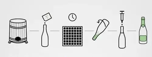 將人工采摘后的葡萄進(jìn)行壓榨后開始第一次發(fā)酵以獲得基酒,隨后將經(jīng)過調(diào)配混合的基酒裝入瓶中,加入少量發(fā)酵液體,開始進(jìn)行第二次發(fā)酵。