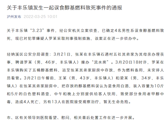 3月25日,四川省瀘州市委員宣傳部在其微信官方公眾號(hào)“瀘州發(fā)布”發(fā)布了《關(guān)于豐樂(lè)鎮(zhèn)發(fā)生一起誤食醇基燃料致死事件的通報(bào)》。通報(bào)稱,關(guān)于豐樂(lè)鎮(zhèn)“3.23”事件,經(jīng)公安機(jī)關(guān)立案?jìng)刹,已確定4名男性系誤食醇基燃料致死,另有13人在醫(yī)院接受觀察治療,暫無(wú)生命危險(xiǎn),該案正在進(jìn)一步偵辦中。