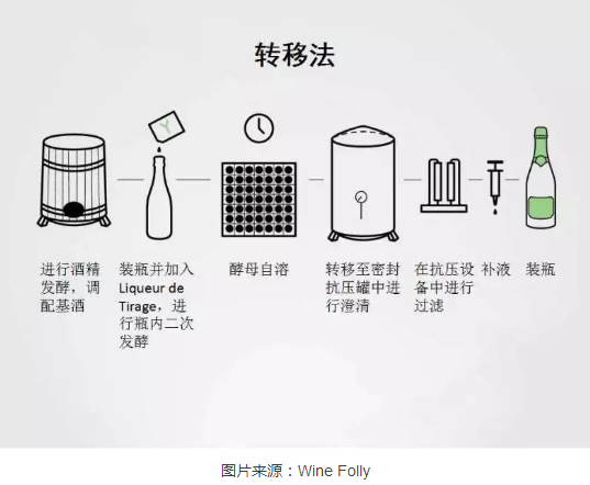 轉移法在初期階段和傳統法相同,只是在瓶內二次發酵完成后不進行轉瓶處理,而是直接將酒倒入密封抗壓罐內,進行澄清后再重新裝瓶。這一方法能夠節約部分成本,因而被普遍用于新世界起泡酒,如80%的澳大利亞起泡酒都使用轉移法釀造。