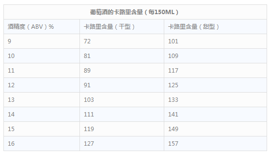 在常見的酒精飲料里面,葡萄酒的卡路里含量是比較低的。以每150ML計算,干型葡萄酒的卡路里大約在70~130之間波動,主要由葡萄酒的酒精含量決定。而甜型葡萄酒的卡路里含量則會更高一些(見下表)。