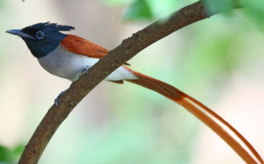 綬帶鳥,又名壽帶鳥、練鵲、長尾鹟、一枝花等。中央兩根尾羽長達身體的四﹑五倍,形似綬帶,故此得名。綬帶鳥的叫聲吉利,音調似“求福、求福”,深受人們的喜愛。