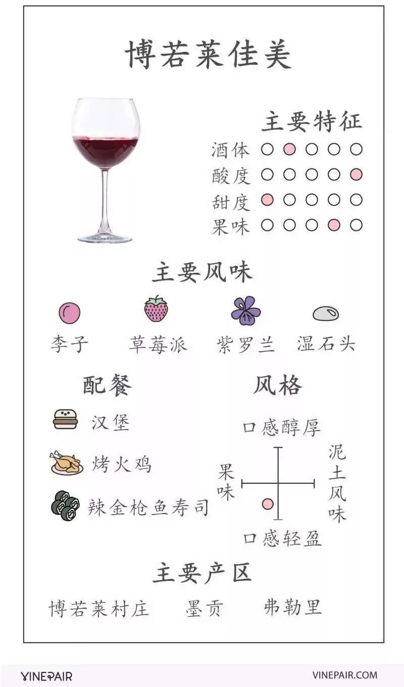 博若萊新酒由100%佳美經獨特的二氧化碳浸漬法(Carbonic Maceration)釀制而成,單寧輕柔,口感酸爽,果香豐富,帶有香蕉、櫻桃、覆盆子和甜蜜的泡泡糖等香氣。而與博若萊新酒果味豐富、清新易飲的風格不同,產自博若萊10個特級村莊的佳美葡萄酒有著多樣的風格,風味復雜,結構感強,部分酒款還具有不錯的陳年潛力。風車磨坊(Moulin-a-Vent)、墨貢(Morgon)和弗勒里(Fleurie)等便是其中典型代表。