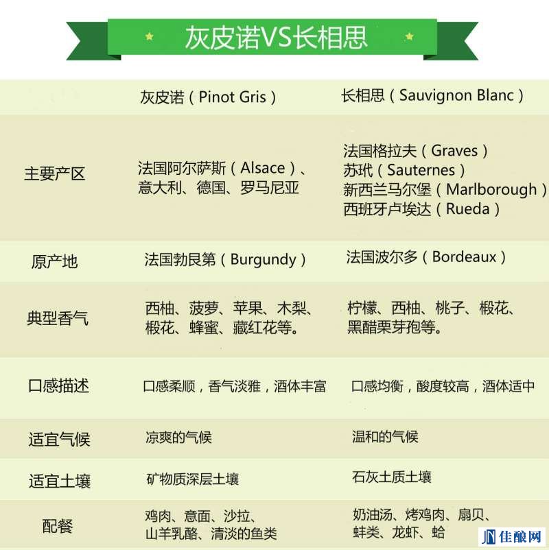 下面,小編通過一張表格來為大家簡單地對比灰皮諾和長相思這兩種葡萄的風味、口感和適宜風土等具體信息。