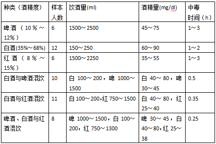 飲酒量、酒精量、中毒時間統計表