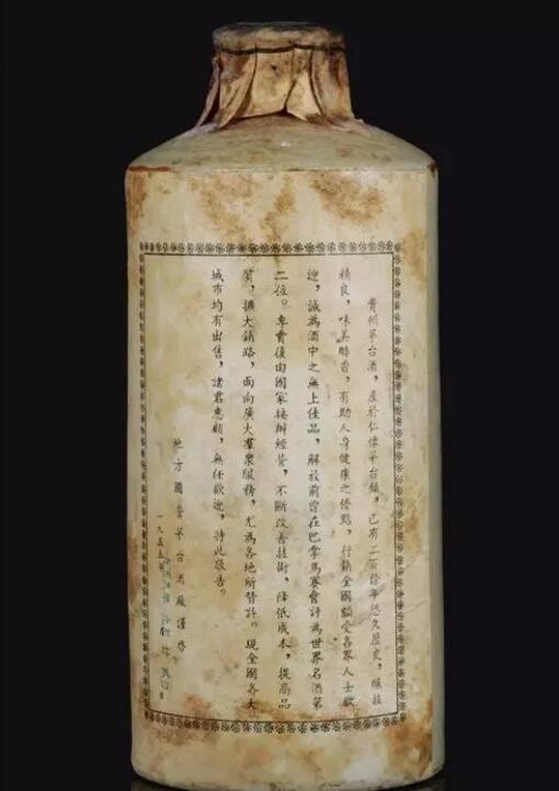 1957年之前的背標樣式與內銷金輪茅臺酒相同,生產日期的標注方式也一樣。1957年,外銷的茅臺酒開始出現了白瓷瓶包裝,而且背標內容也發生了巨大變化。