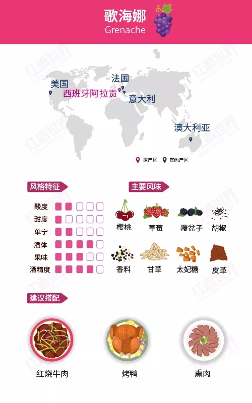 作為全球種植面積最廣的紅葡萄品種之一,歌海娜遍布法國、西班牙、意大利、美國、澳大利亞等多個產酒國。在法國南羅訥河谷(Southern Rhone Valley)的教皇新堡(Chateauneuf du Pape)產區,釀酒師通常將歌海娜與西拉(Syrah)、慕合懷特(Mourvedre)和神索(Cinsault)等葡萄品種混釀來打造優質的紅葡萄酒。除此之外,越來越多的釀酒師開始采用歌海娜來釀造單一品種紅葡萄酒,它的魅力值得你去慢慢探索。