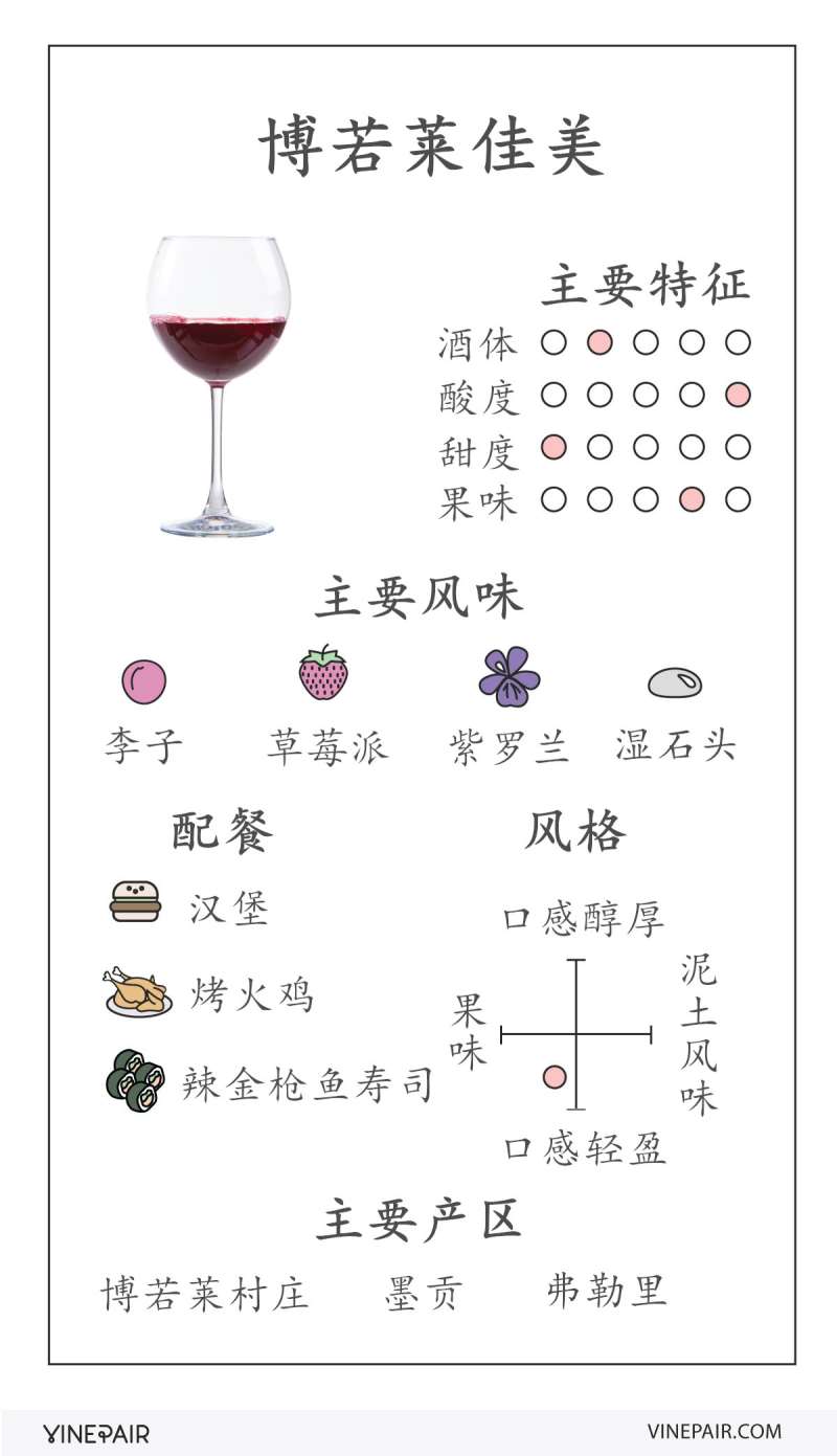 博若萊新酒是由100%佳美經獨特的二氧化碳浸漬法(Carbonic Maceration)釀制而成,單寧輕柔,口感酸爽,果香豐富,帶有香蕉、櫻桃、覆盆子和甜蜜的泡泡糖等香氣。而與博若萊新酒果味豐富、清新易飲的風格不同,產自博若萊10個特級村莊的佳美葡萄酒有著多樣的風格,風味復雜,結構感強,部分酒款還具有不錯的陳年潛力。風車磨坊(Moulin-a-Vent)、墨貢(Morgon)和弗勒里(Fleurie)等便是其中典型代表。