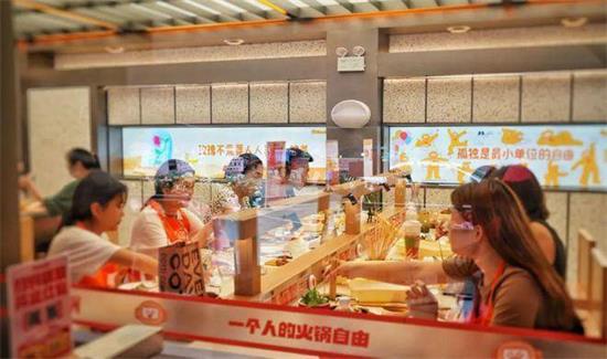 于是,其在萬象匯店率先探索“一人食小火鍋”:外擺區的4張4人桌改成了18張一人食桌位,并且把鍋底降到了9.9元。