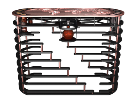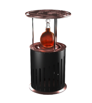 卡慕禧年5.50系列整體采用玫瑰金設計,形似制作珍貴干邑的蒸餾器,黑色周身盡顯精致典雅;酒盒將航空和汽車行業使用的鈦、鋁高精度機械裝置相結合,使得干邑的存放更經得起時間的考驗;佳釀容器特別選用了被譽為“Héritage Paraison”的Baccarat(巴卡拉)水晶酒樽,球形瓶身更好地凸顯了酒液的光澤;而禧年品鑒桌則由300 多個部件組成,是技術實力的集中體現。