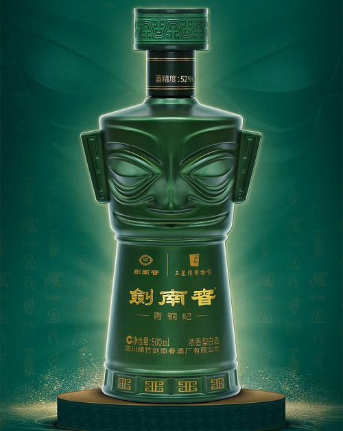 近日,小酒瓶獲悉劍南春將于2021年12月12日發布一款劍南春與三星堆博物館的聯名酒——劍南春·青銅紀。小酒瓶了解到此款產品瓶體采用三星堆青銅面具造型,獨有的青銅釉色渲染,辨識度極高。外盒延續青綠色設計,并采用高檔皮革制成,盒子頂部和底部鍍金;盒內還含立體面具造型的兩個小酒杯,漸變色自然過渡,精致優雅。