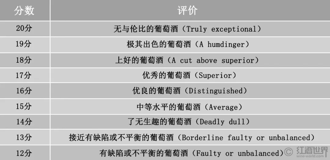 2000年,JR的官方網站(www.jancisrobinson.com)正式上線。她帶領了一支專業團隊在網站上發表文章,發布酒款評分和品鑒記錄等。JR的評分是根據品鑒時的感受并結合酒款的發展潛力而定,有時,他們也會使用“+”或“++”來表示葡萄酒在陳年后將會達到更高的品質。JR認為,葡萄酒的品評沒有一個單一的標準,她會盡量展現一款酒的相對價值。比如在品鑒新西蘭的黑皮諾(Pinot Noir)葡萄酒時,她會以新世界的情況作為背景給酒款打分,而不是采用勃艮第(Burgundy)葡萄酒的評判標準。JR團隊采用的是歐洲傳統的20分制評分體系,獲得16分及以上分數的酒款便可視為優秀酒款,詳見下表。