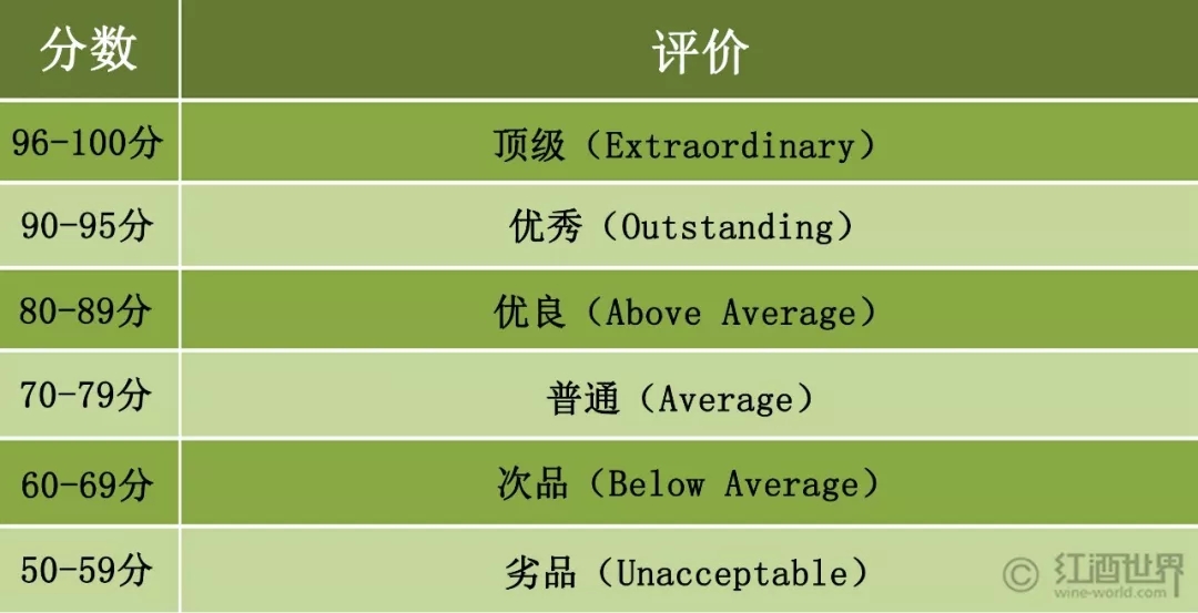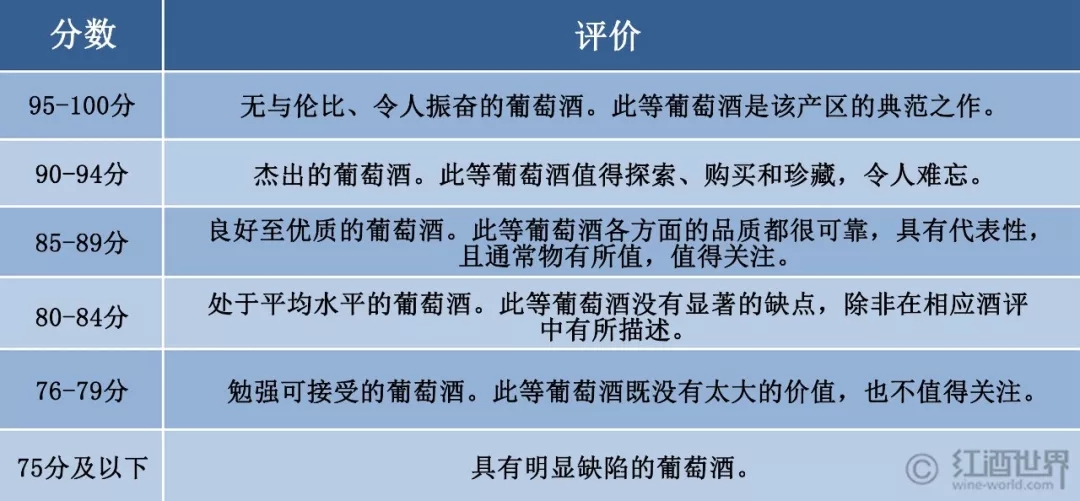 艾倫領導著一個專業的團隊進行品評工作,并將分數和品鑒記錄發表在其網站上。他們側重葡萄酒的純凈度、優雅、平衡性以及對風土特點的詮釋,同時也重視其個性、濃郁度、余味和整體的和諧。一般情況下,該網站會給已經裝瓶的酒款一個具體的分數,而對于那些還在橡木桶中熟成的葡萄酒則會給出一個分數范圍。值得注意的是,其評分是根據酒款在巔峰時期的預期質量而定的。勃艮第葡萄酒網的評分采用百分制,共分為以下6個等級。