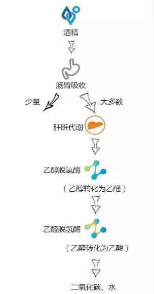 酒精(也就是乙醇),在身體內乙醇脫氫酶的作用下會轉變成有毒的乙醛,然后再在乙醛脫氫酶的作用下,轉變成無毒的乙酸(就是醋酸,是食醋的主要成分),這就是肝臟的解酒過程。