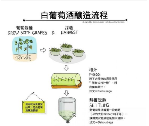 葡萄酒釀制原理其實非常的簡易,但其過程卻可能會因著每位釀酒師工法之別而差之千里.以下分解圖為白葡萄酒釀制步驟大綱: