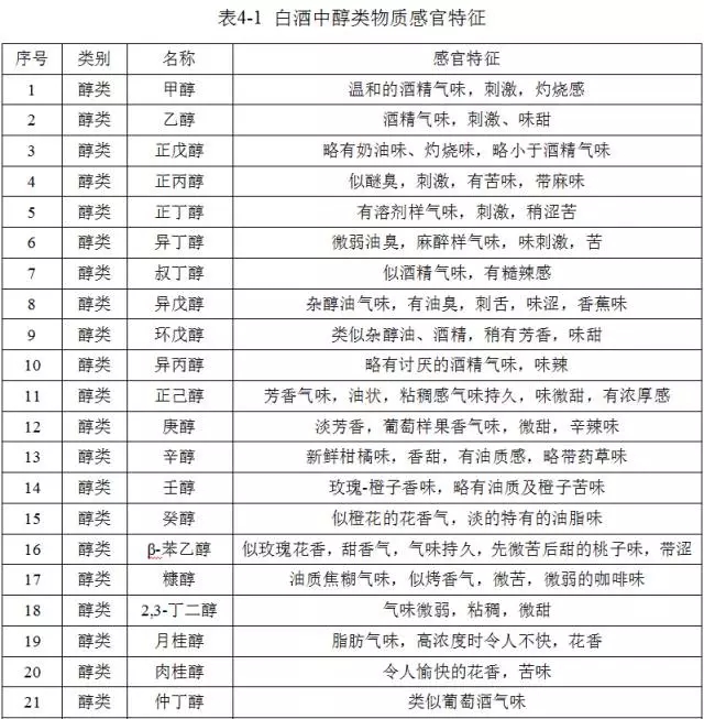 例如:適量的正丙醇、異丁醇、異戊醇可起襯托酯香的作用,使香氣更豐滿,在呈味方面它們可使白酒有后勁,使味道的持續時間長,是白酒中不可缺少的香氣和口味成分;若其含量過少,則會使白酒的味道十分淡薄,過高則會使人感到不愉快的苦澀怪味即“雜醇油味”。