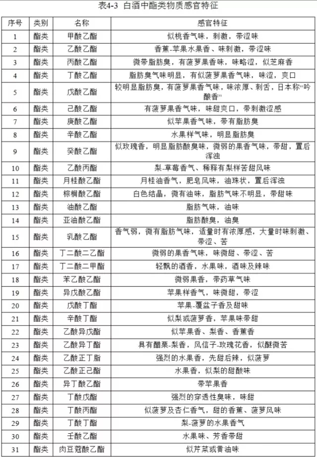 在酒體中,酯類化合物與其他組分相比絕對含量較高,而且酯類化合物大都屬較易揮發且氣味較強的化合物,具有著果實氣味或獨特芳香氣味,因此表現出的氣味特征較強,可賦予白酒令人愉悅的果香。