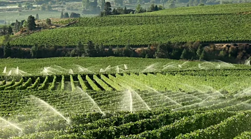 在葡萄園中專門設(shè)置固定或可移動的噴灌裝置,使水在加壓的情況下通過管道和噴頭形成人工降雨,給葡萄植株提供水分。使用這種方式進行灌溉既可以控制噴水量,又提高了灌溉的均勻性。如果設(shè)計得當(dāng),噴灌還可在夏季高溫時用來降低葡萄園內(nèi)的氣溫,或者在冬季用來預(yù)防霜凍災(zāi)害。但噴灌時水分蒸發(fā)較多,且易造成葡萄園中潮濕的環(huán)境,從而增加滋生病害的風(fēng)險。