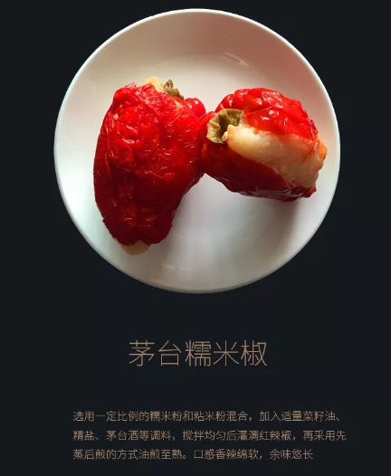 【茅臺糯米椒】選用一定比例的糯米粉和粘米粉混合,加入適量菜籽油、精鹽、茅臺酒等調料,攪拌均勻后灌滿紅辣椒,再采用先蒸后煎的方式油煎至熟。口感香辣綿軟,余味悠長。